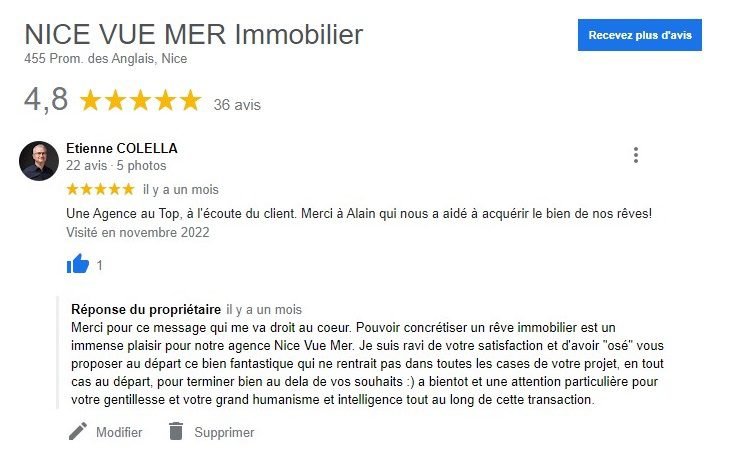 Des clients satisfaits c est notre moteur au quotidien ! Alors si vous aussi vous souhaitez VOTRE Vue Mer, appelez nous et nous la trouverons ! Si vous avez déja une Vue Mer, appelez nous aussi, nous la vendrons a coup sur ! Retrouvez la Story de cette vente sur ce lien dans nos "biens vendus" : Appartement de Luxe Palais Maeterlinck Vendu au Cap de...