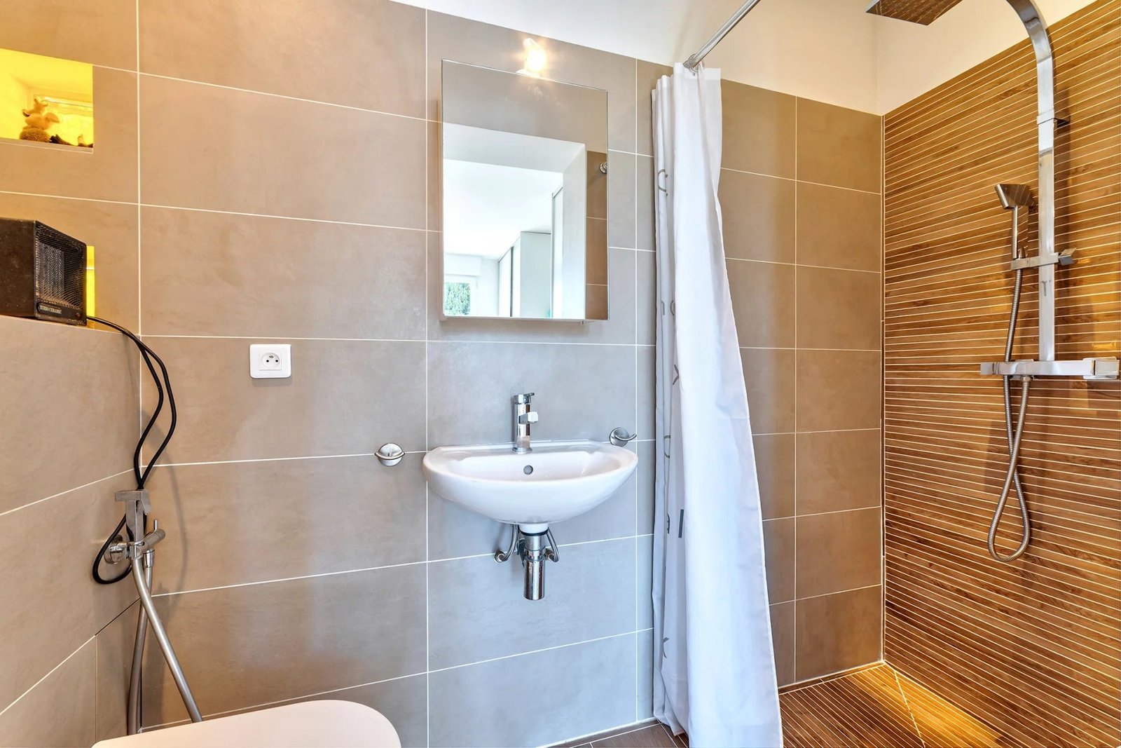 On the main floor, a large, bright living room opens onto a spacious terrace. The modern kitchen, open to the living room, also has a terrace. This level has 3 en-suite bedrooms, a separate toilet and an entrance with cupboard.