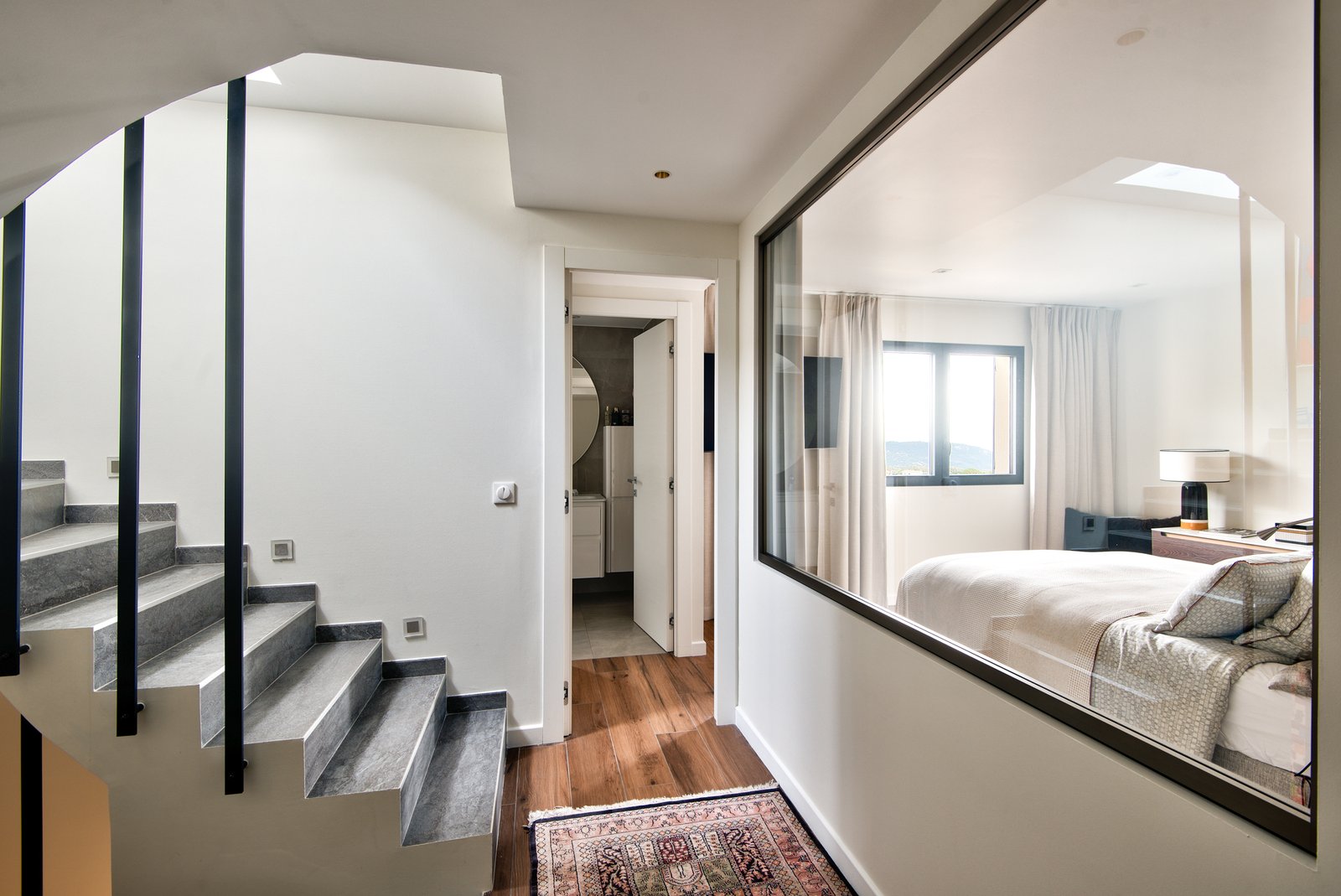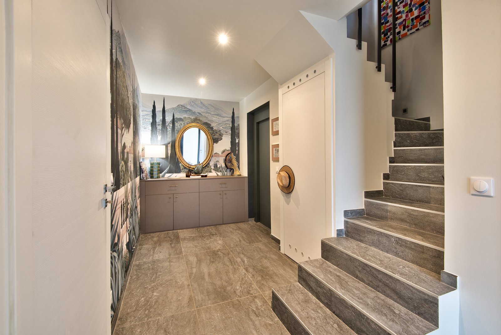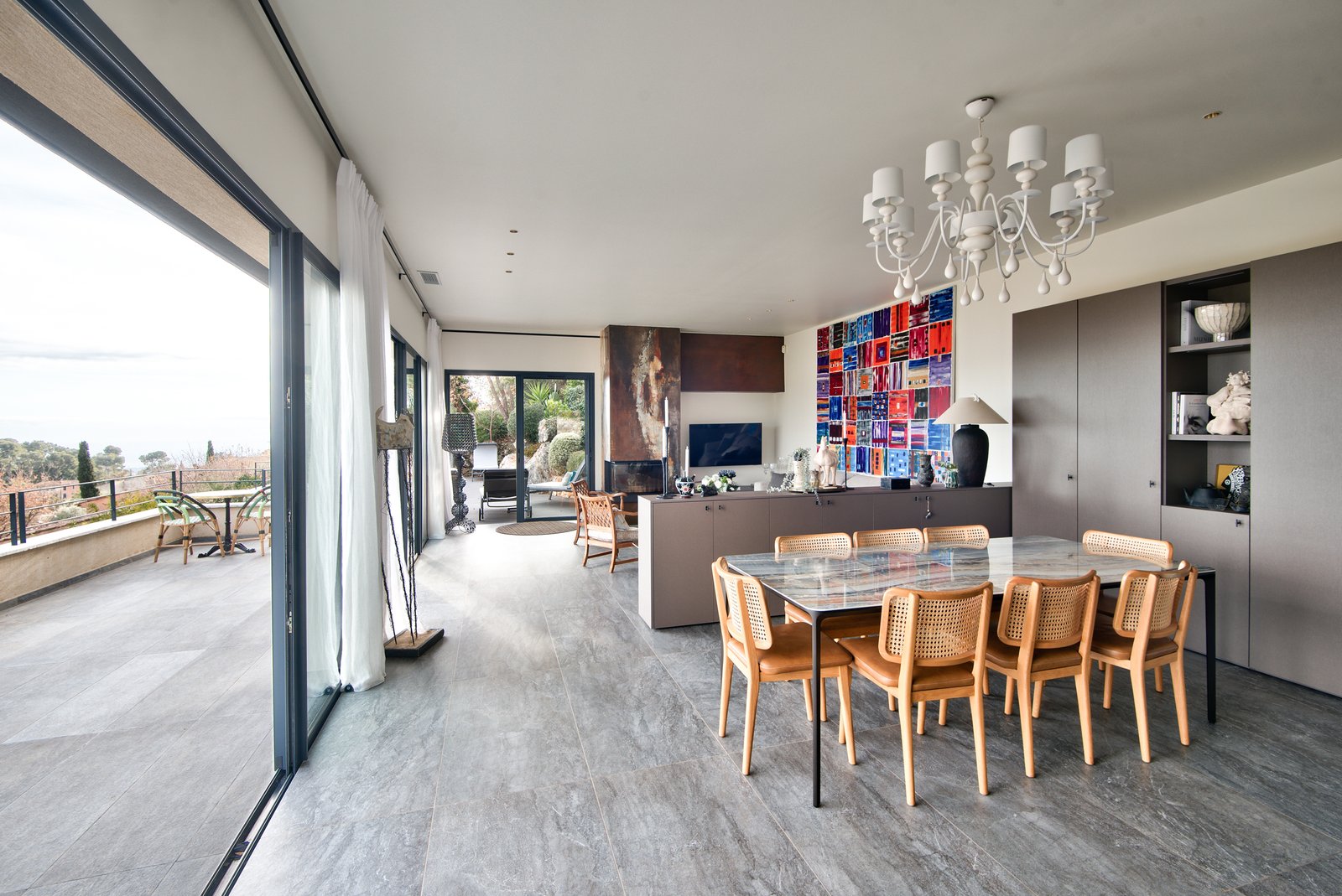 The top floor consists of a superb living room of nearly 75 m², very bright thanks to its triple exposure. The large living room with fireplace opens onto a fitted and equipped kitchen, all opening onto a magnificent terrace of 41 m² and the swimming pool offering an exceptional panorama.