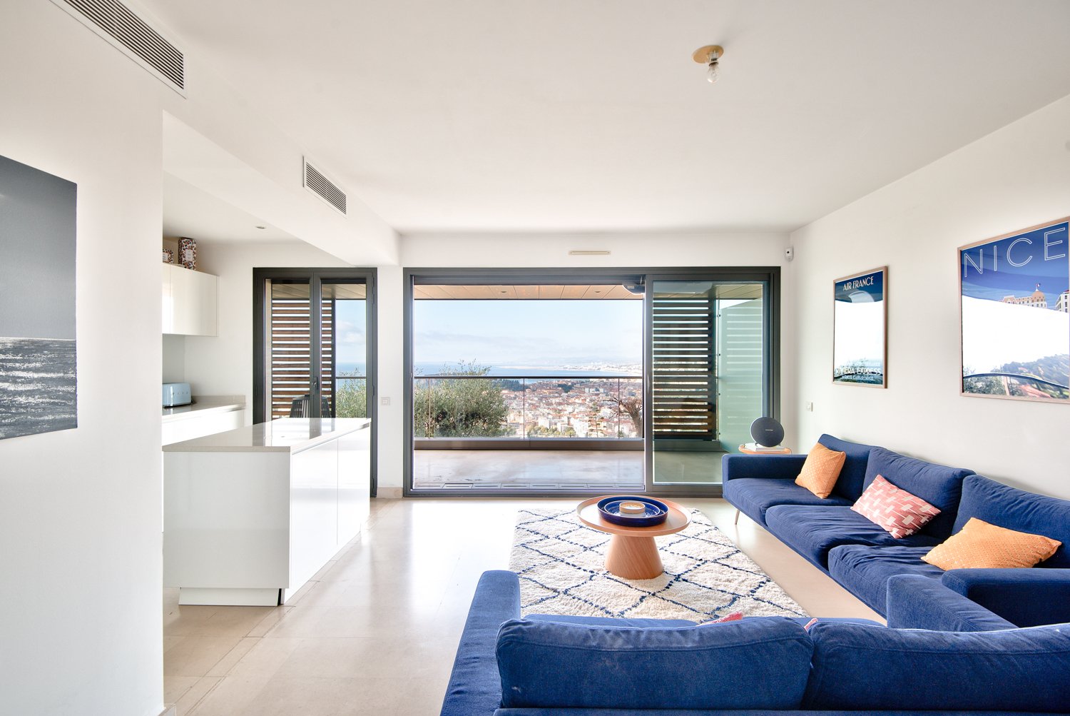 The apartment consists of an entrance, a bright living room extended by an exceptional terrace of nearly 100 m², offering a breathtaking sea and city view. A fully fitted and equipped kitchen open to the living room, a separate toilet, three bedrooms, a shower room, a bathroom with toilet and a second terrace of more than 11 m².