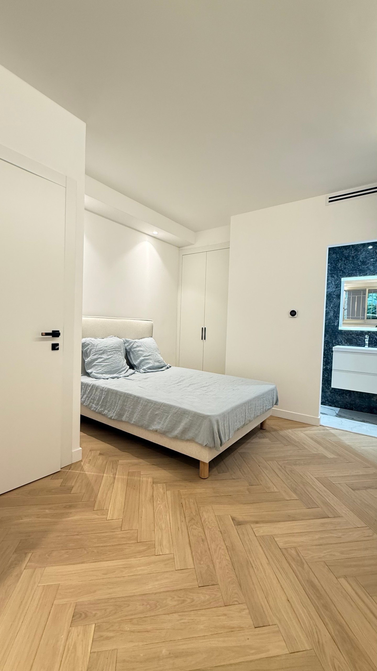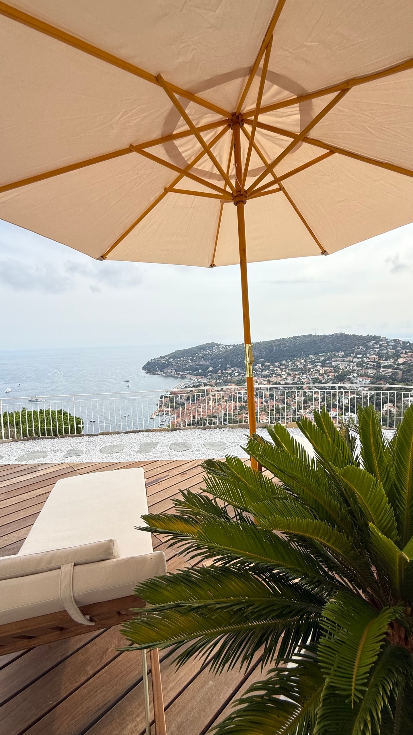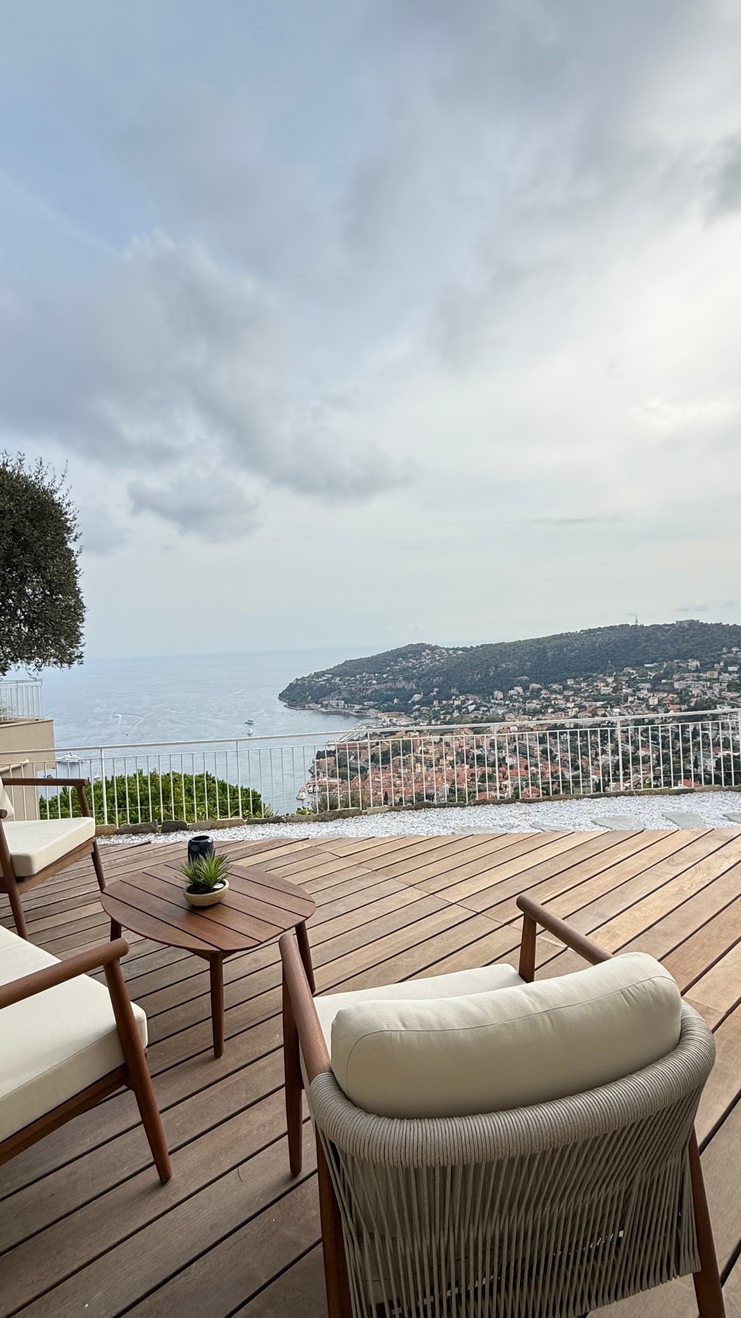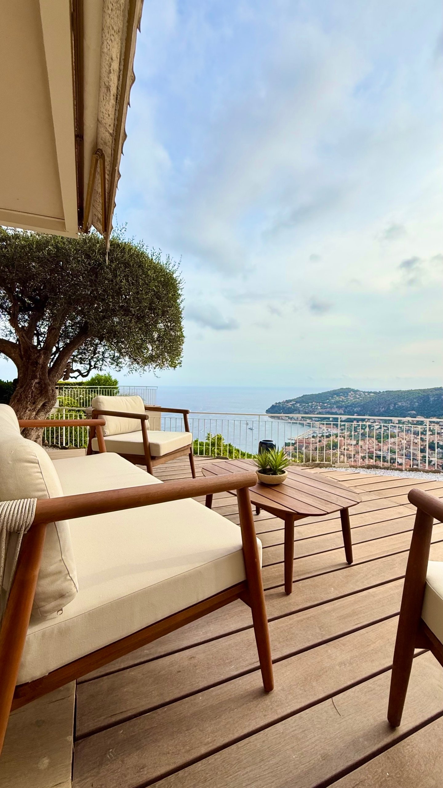 The apartment opens onto a beautiful bright living room with fully equipped American kitchen, extended by a huge terrace of 110 m² facing south, offering a breathtaking panoramic sea view of the bay of Villefranche and Cap Ferrat.