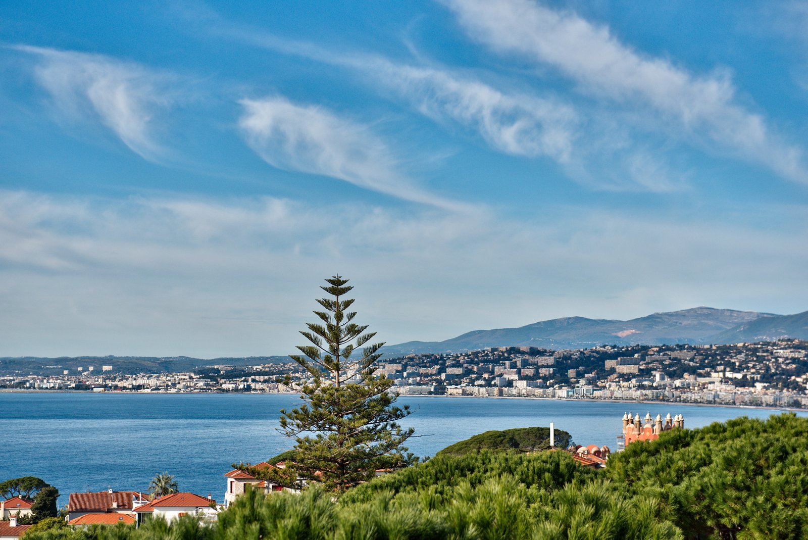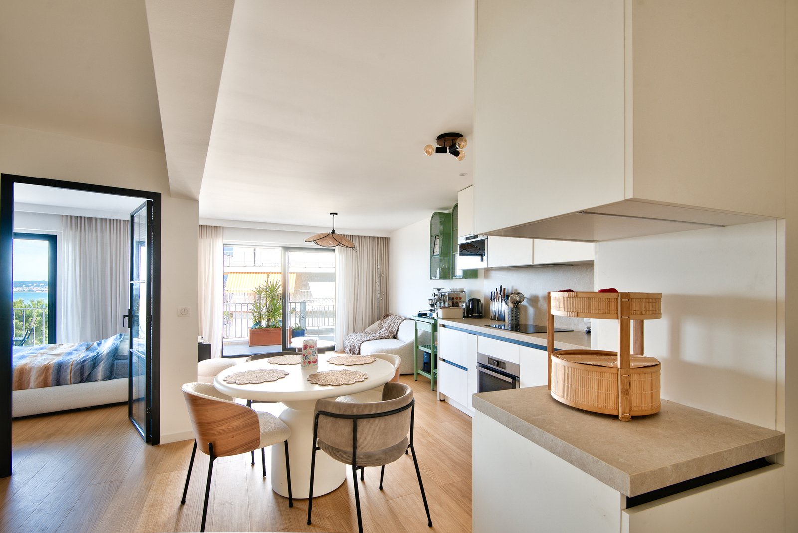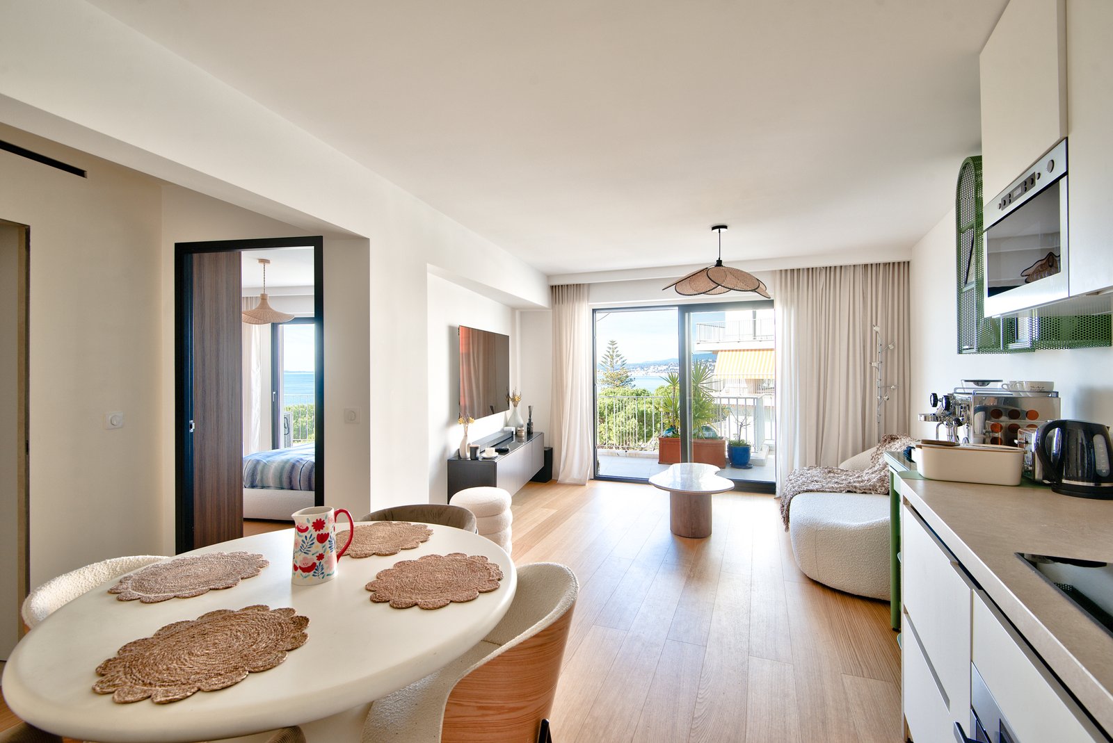 Il comprend un séjour avec cuisine aménagée lumineux s’ouvrant sur une magnifique terrasse de 15 m² et offrant une vue imprenable sur la mer et la Baie des Anges, deux chambres, une salle d’eau et un WC indépendant.