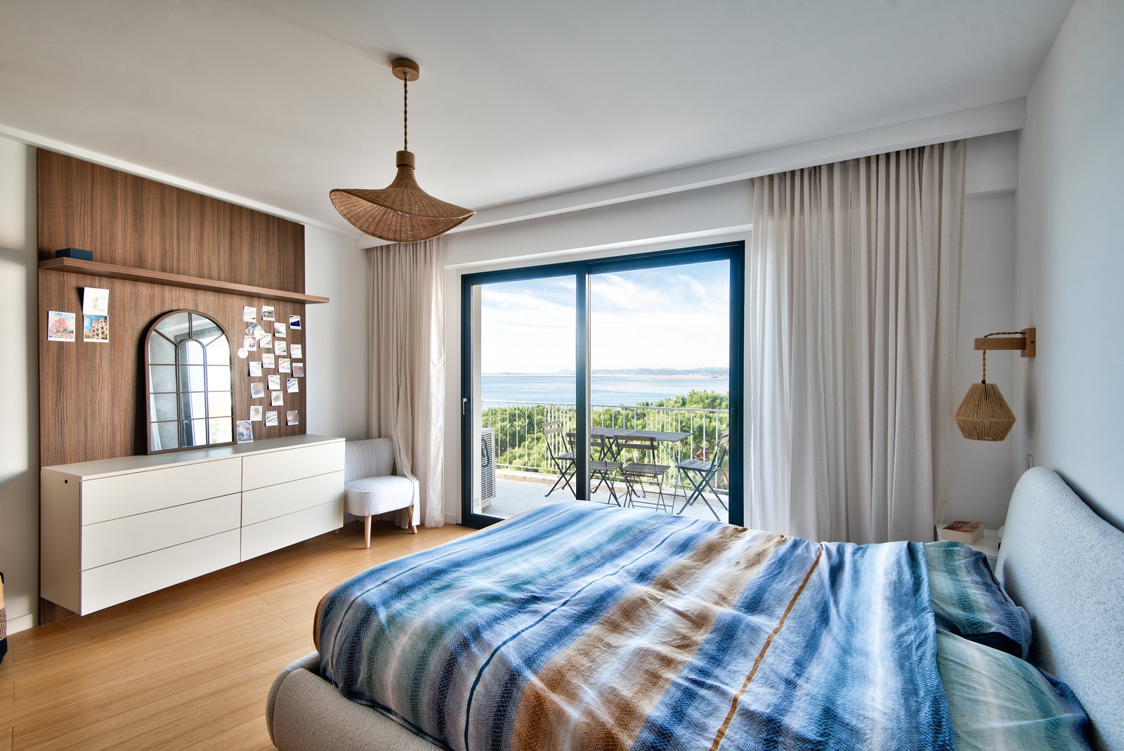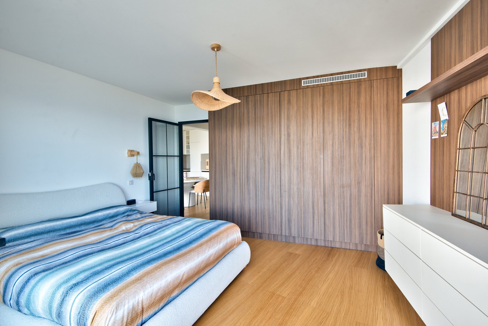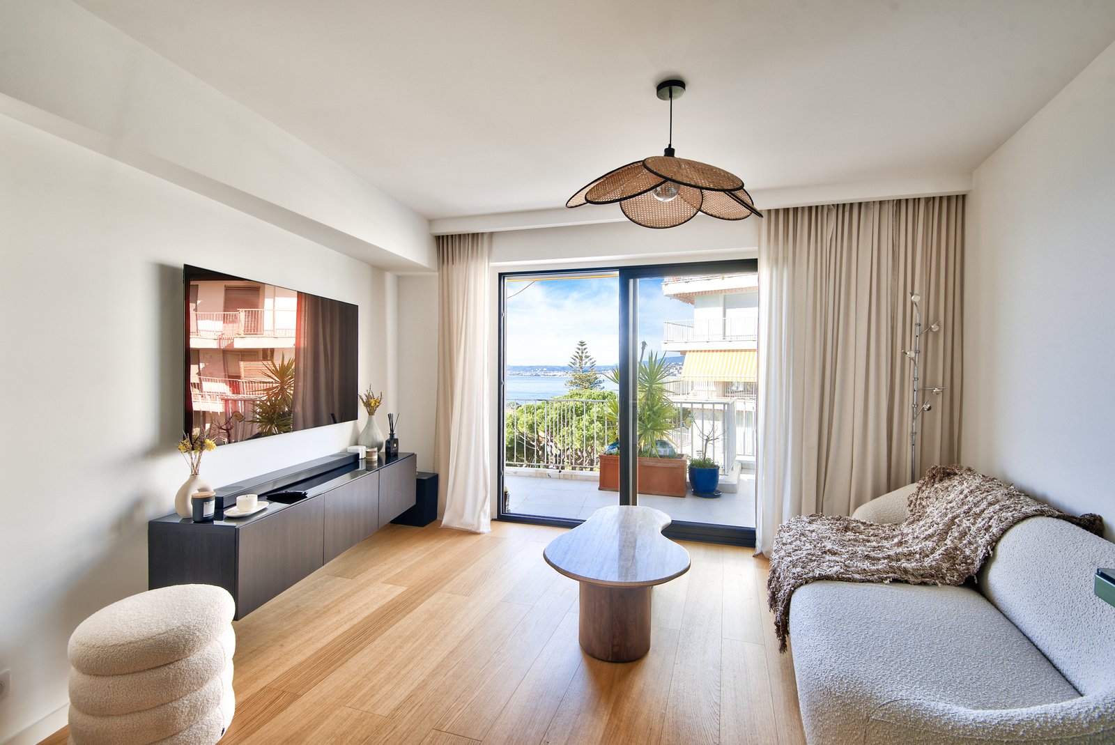 Il comprend un séjour avec cuisine aménagée lumineux s’ouvrant sur une magnifique terrasse de 15 m² et offrant une vue imprenable sur la mer et la Baie des Anges, deux chambres, une salle d’eau et un WC indépendant.