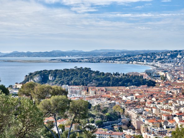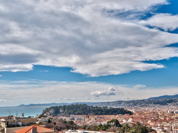 Cette résidence de standing avec piscine se compose de trois bâtiments dont les façades s’ouvrent très majoritairement côté mer, l’arrière étant encaissé dans la falaise rocheuse du Mont-Boron.