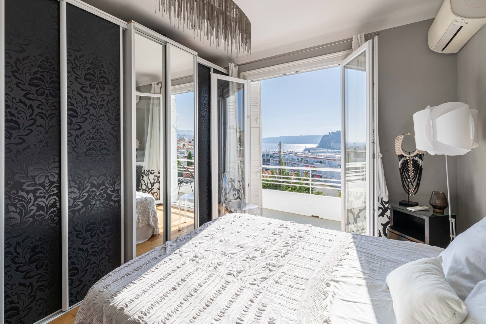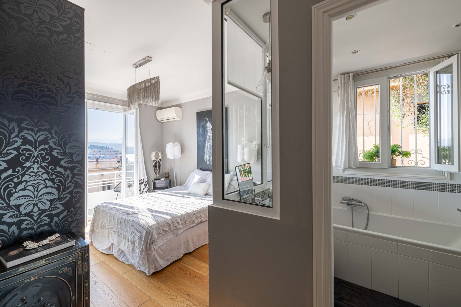 À mi-niveau se trouve une première chambre/bureau, tandis qu’à l’étage, deux chambres spacieuses bénéficient d’une magnifique vue panoramique sur la mer, le port et la ville, et ouvrent toutes deux sur un balcon. Ces chambres sont accompagnées de deux salles de bains avec toilettes. Un toilette invité complète le niveau principal.