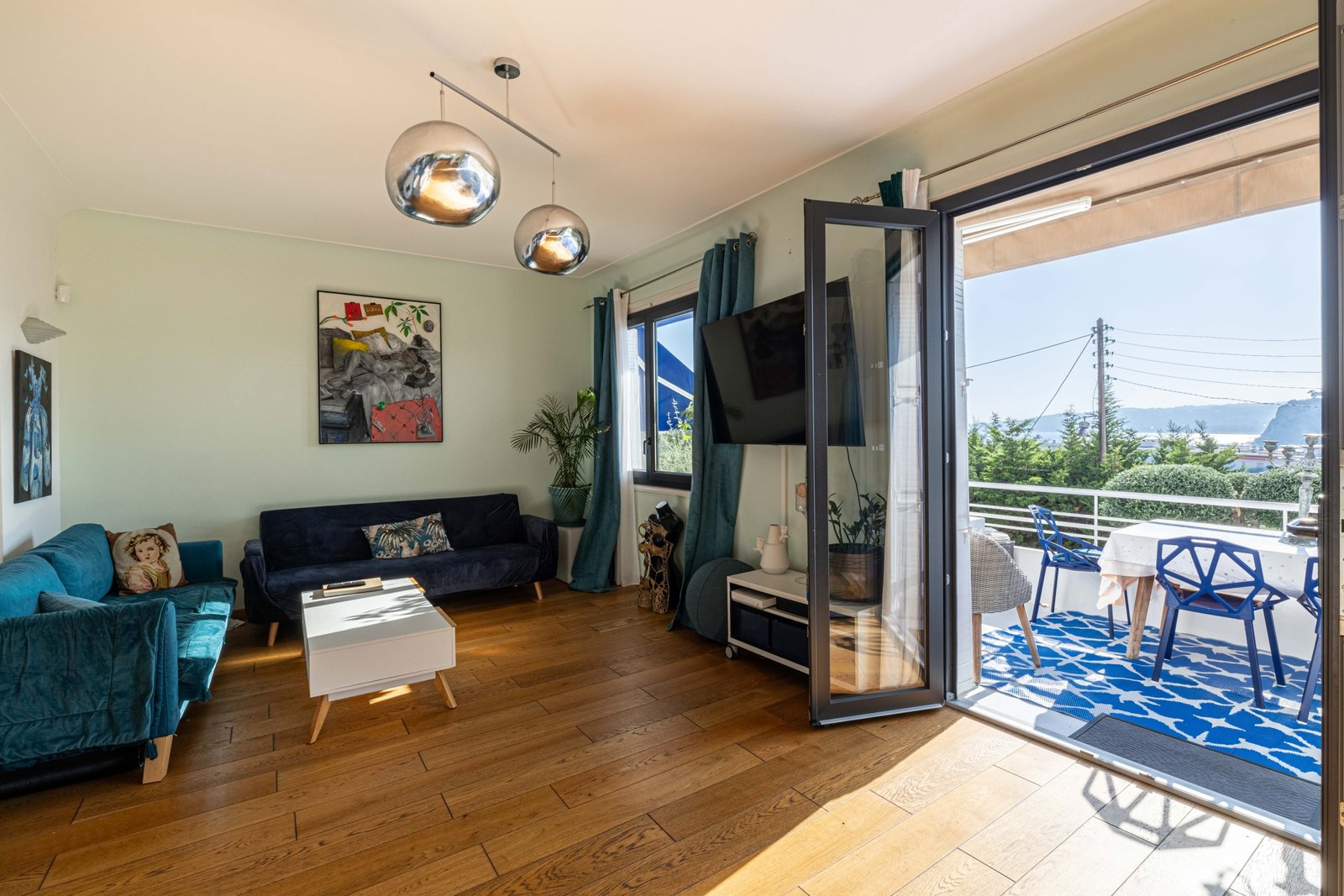 La maison se compose d’un lumineux séjour avec salle à manger et d’une cuisine ouvrant sur une belle terrasse avec vue mer et ville.