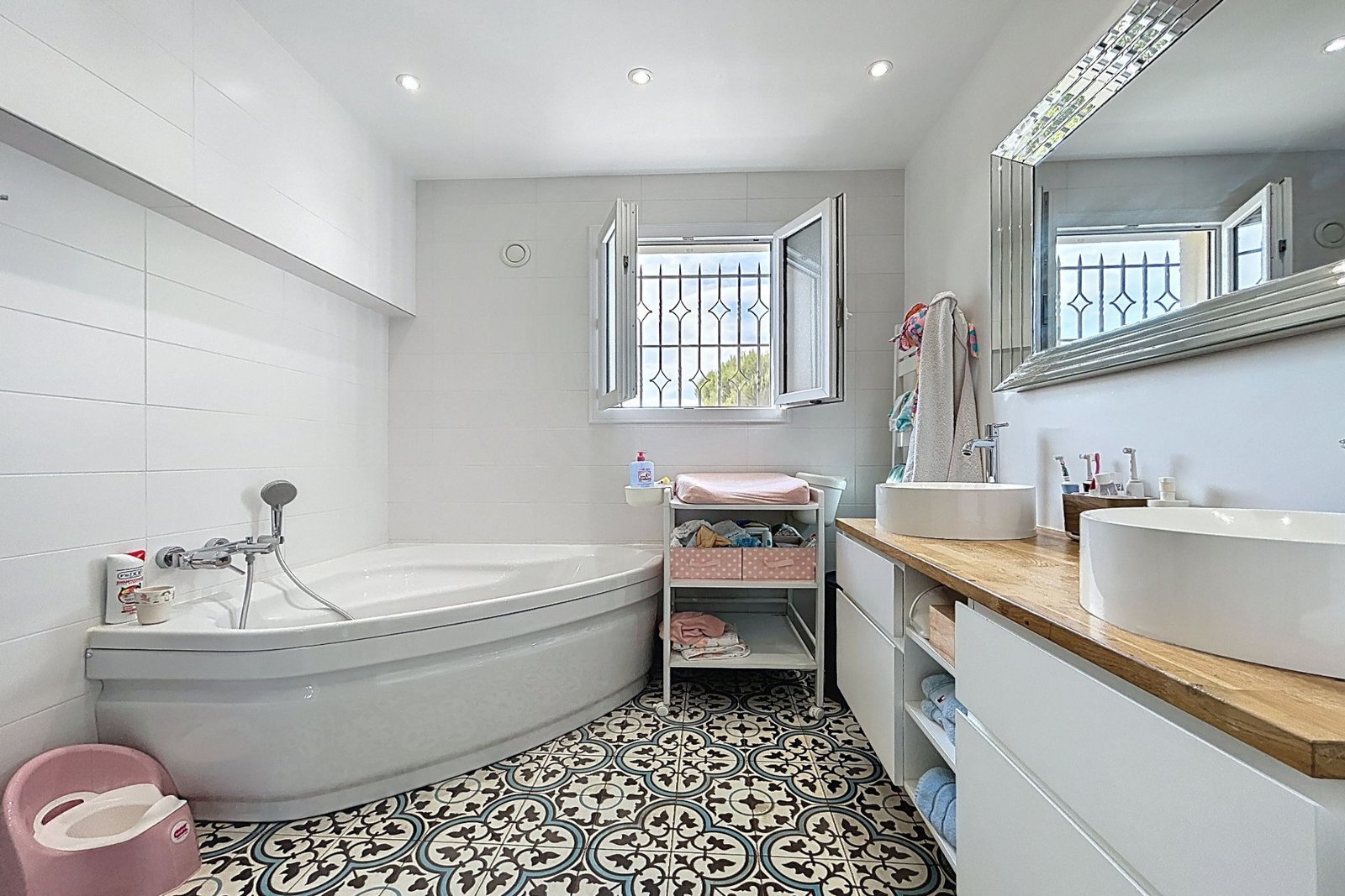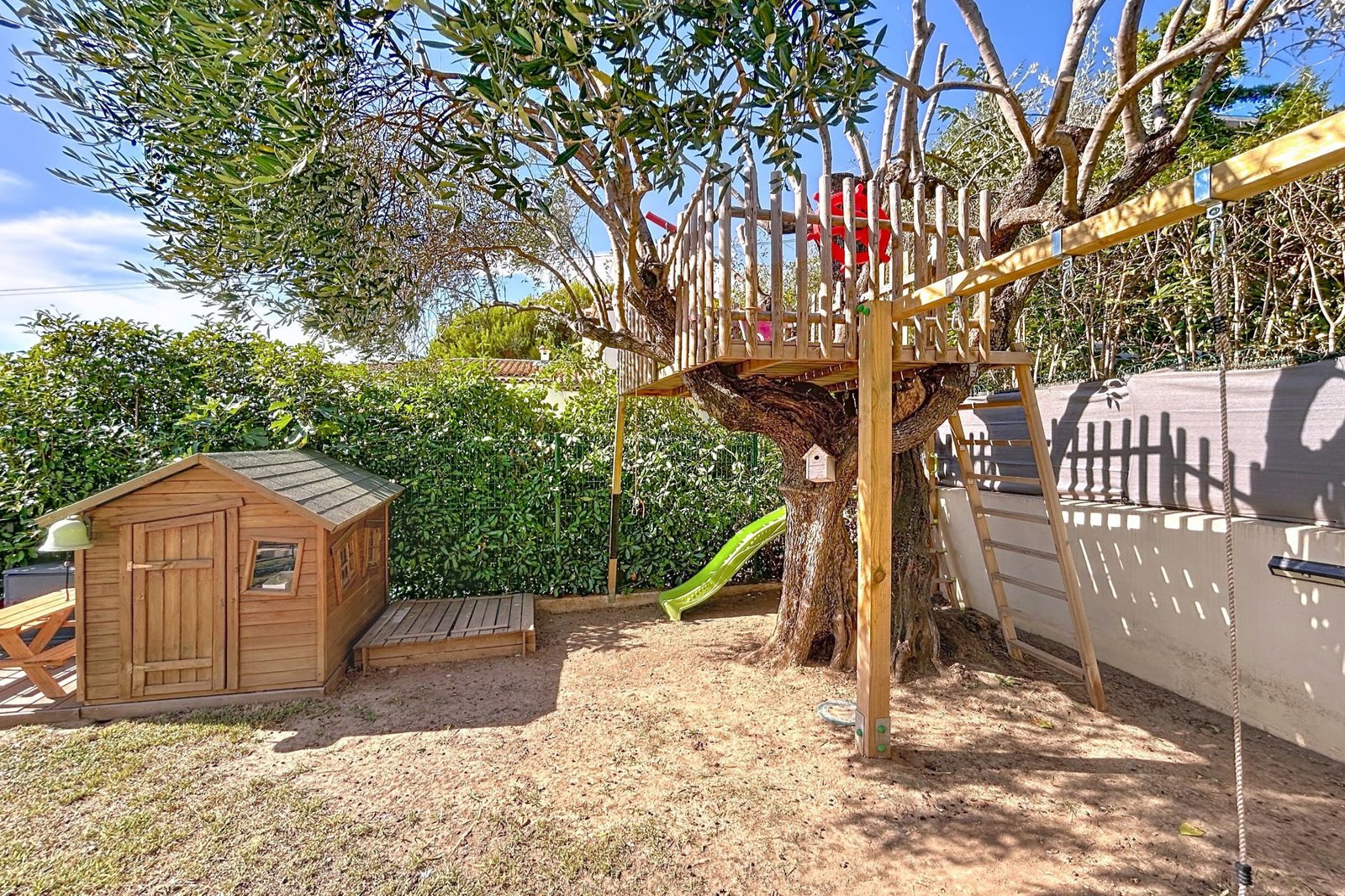 À l’extérieur, plusieurs espaces entourent la maison : PISCINE et solarium, salon et cuisine d’été équipées, terrain de pétanque et aire de jeux pour les enfants.