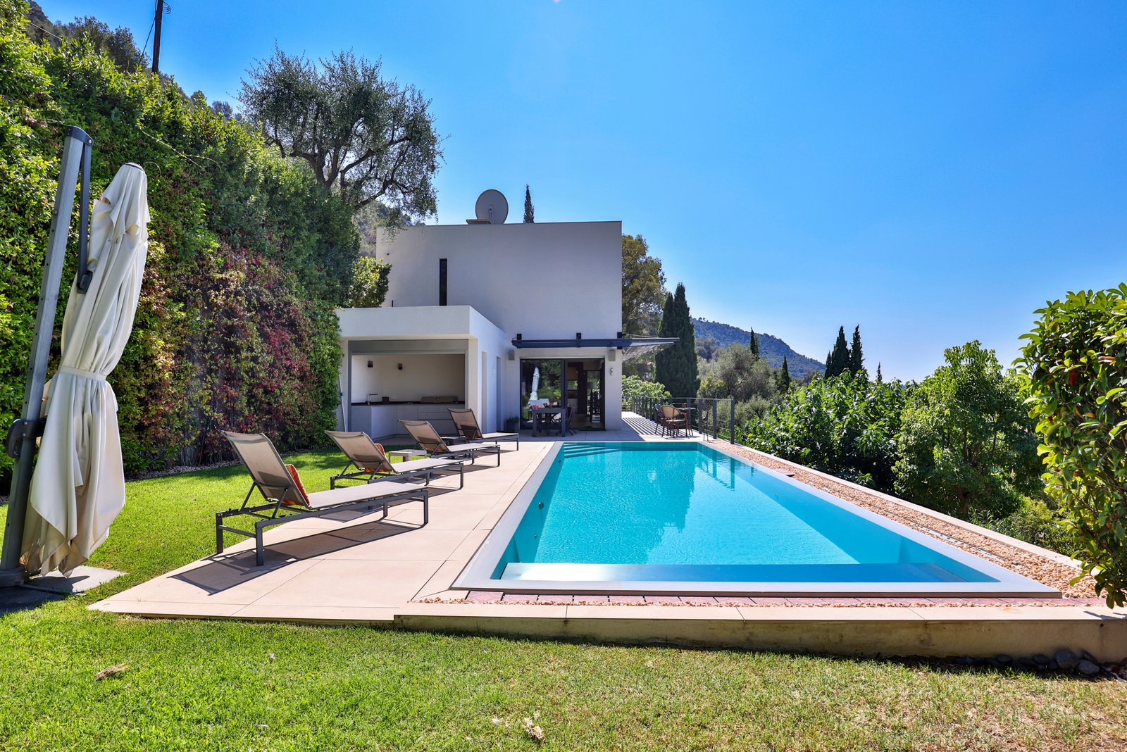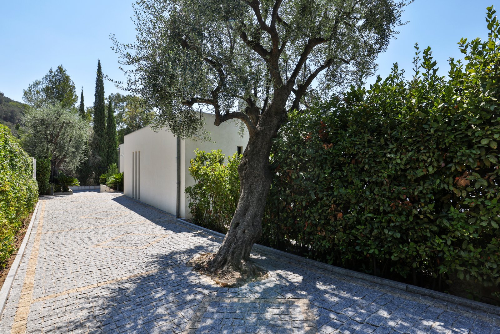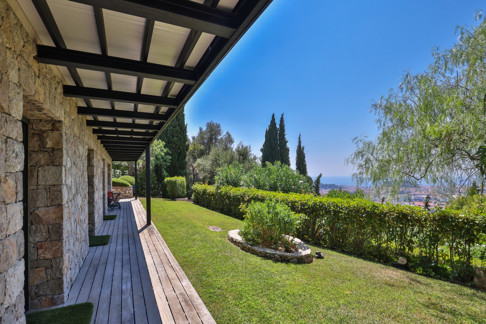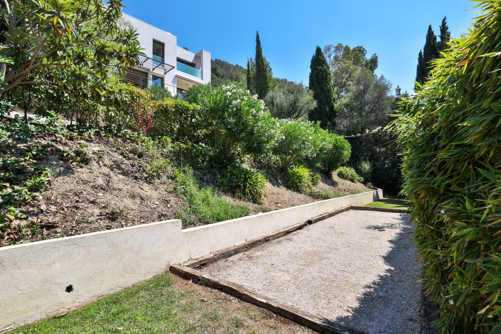 NICE Grande Corniche/Vinaigrier : Edifiée sur un terrain arboré de 1700 m², superbe villa contemporaine rénovée aux prestations luxueuses. Cette propriété jouit d’une très belle vue panoramique sur la baie des anges et bénéficie d’une piscine chauffée à débordement avec poolhouse et d’un boulodrome.