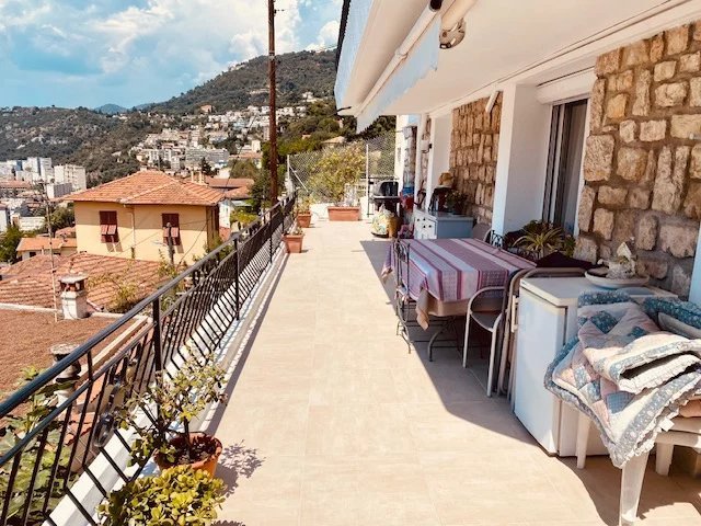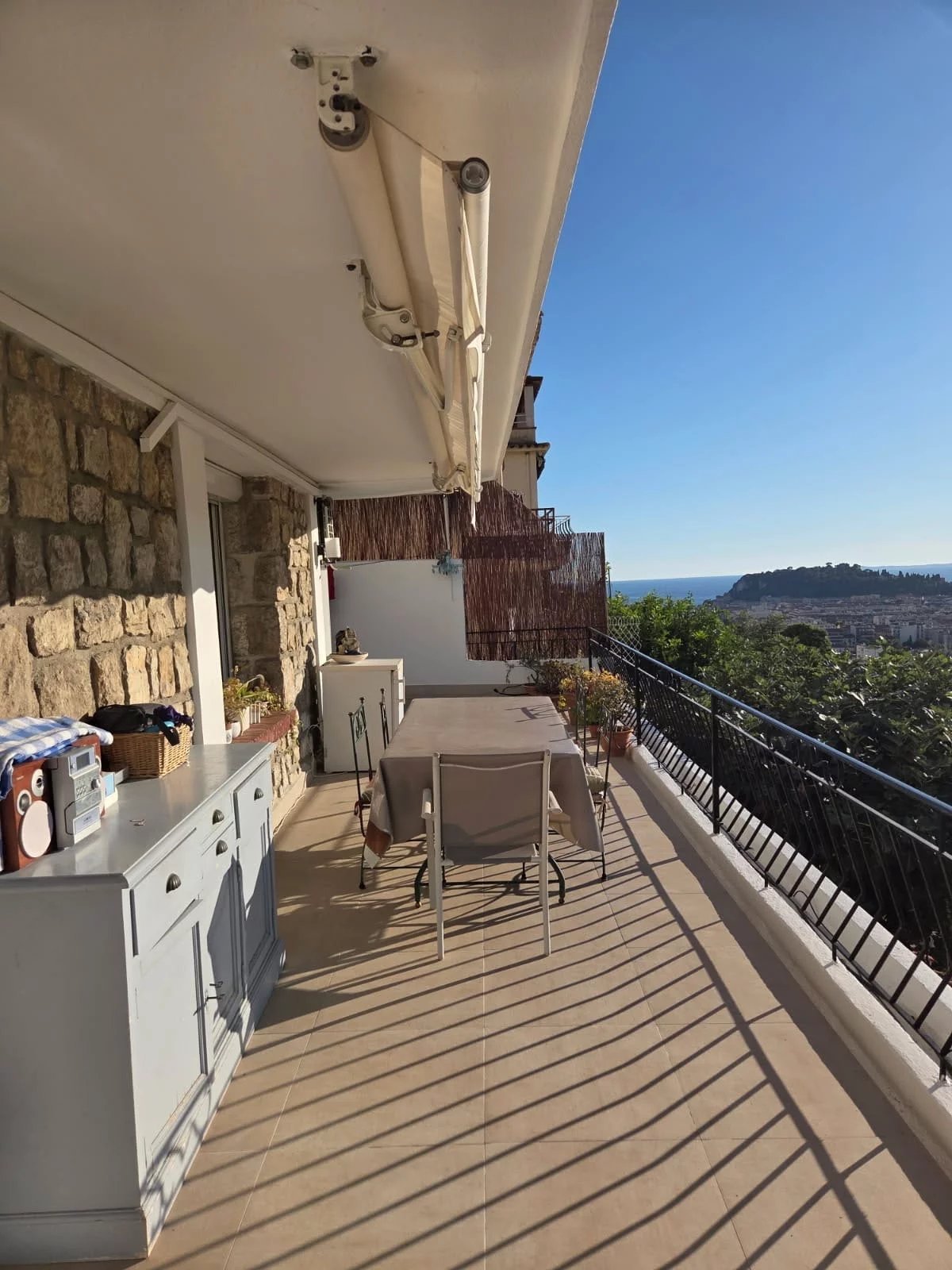 NICE – MONT BORON APPARTEMENT 58M² Dans petite copropriété, lumineux appartement 3 pièces avec vue panoramique imprenable. Dès l’entrée, le ton est donné, le séjour, avec sa cuisine US équipée s’ouvre sur une superbe terrasse de 60 m2 avec un ensoleillement maximum. Chaque hambre est pourvue d’une salle d’eau privative avec toilettes. Cet appartement a été entièrement rénové, y compris plomberie et électricité. le store et les volets roulants sont électriques. toutes les fenêtres sont en double vitrage, une climatisation réversible permet de maintenir une agréable température tout au long de l’année ainsi qu’un chauffage individuel au gaz pour plus de confort. Vous serez ravis de passer de beaux moments en famille sur la vaste terrasse avec sa splendide vue et de profiter des magnifiques couchers de soleil le soir venu. Une place de stationnement voiture et un emplacement moto sont compris dans le prix. un petit local à usage de cave est en partage avec le deux autre propriétaires. Honoraires inclus charge vendeurs. Les expositions sur les risques auxquels ce bien est exposé sont disponibles sur le site : georisques.gouv.fr Nombre de lots dans la copropriété 3. Syndic bénévole 650 euros de charges/an eau froide comprise.