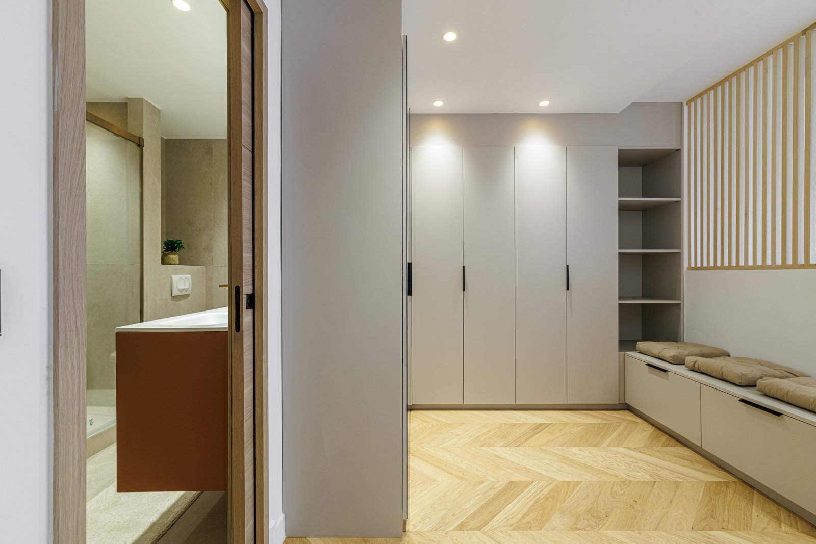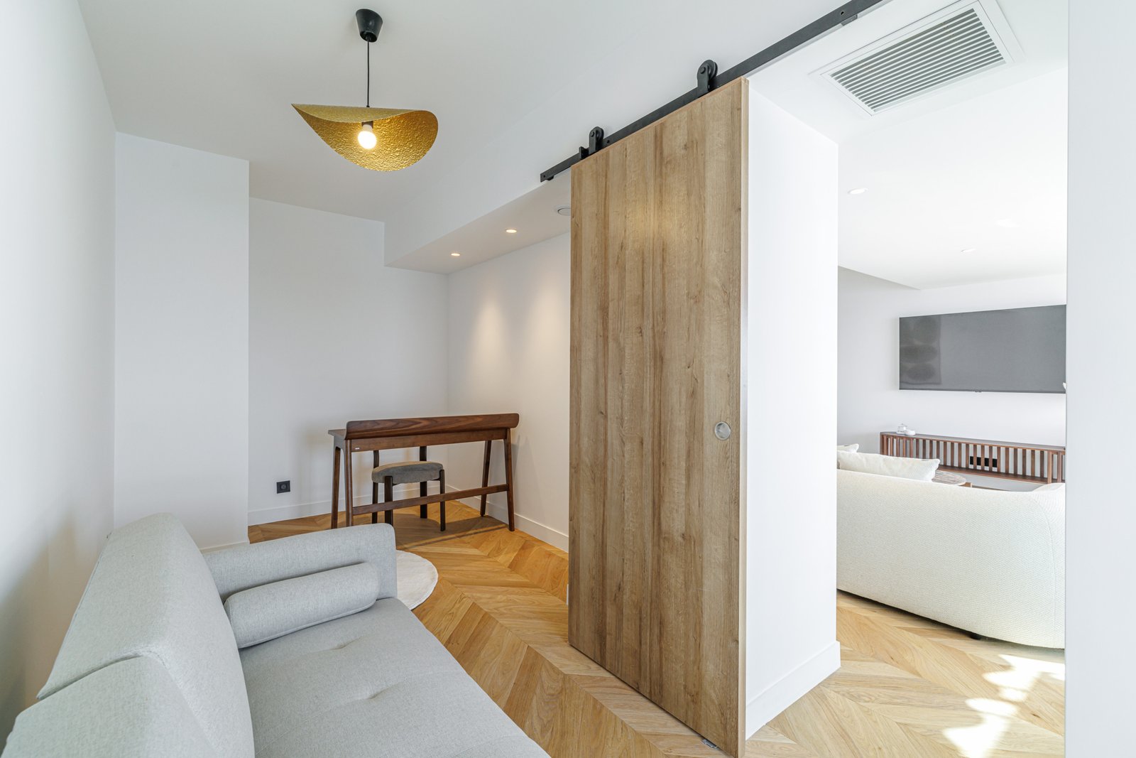 Dès l’entrée, les volumes généreux et la décoration soignée confèrent une atmosphère à la fois élégante et chaleureuse. Le vaste séjour, baigné de lumière naturelle, s’organise autour d’un espace salon raffiné et d’une cuisine américaine entièrement équipée, pensée pour allier esthétique et fonctionnalité. Le sol en parquet Pointe de Hongrie apporte une touche de caractère à l’ensemble.